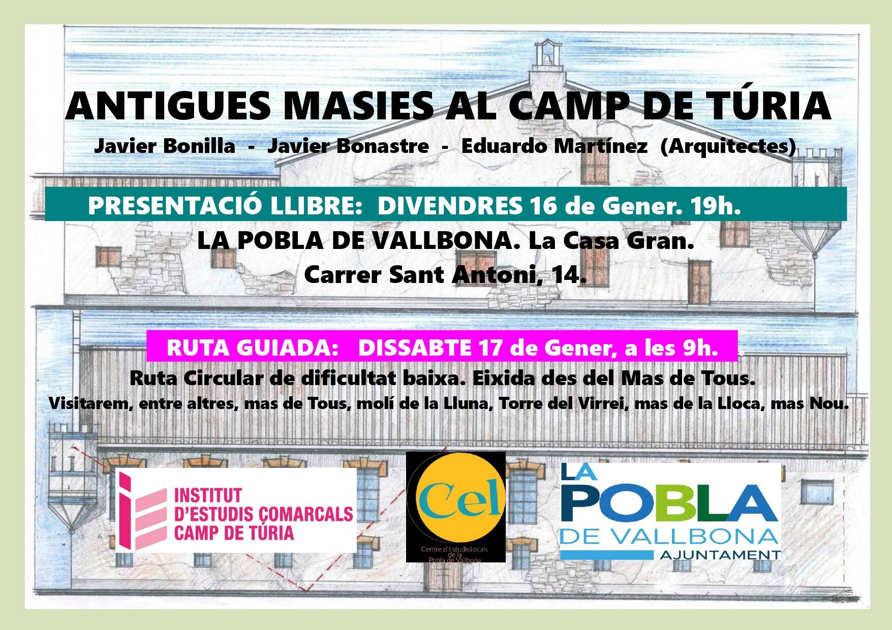 Ahí s’ha acabat el cap de setmana d’Antigues Masies fet a La Pobla on el Divendres és presentà el llibre editat per l’IDECO Camp de Túria i explicat pels seus autors: ANTIGUES MASIES DEL CAMP DE TÚRIA. Molt bon treball. Una publicació subvencionada per la Diputació que ja s’ha presentat a Riba-roja de Túria i a Bétera i en els dos llocs es feu una ruta guiada per algunes de les masies presentades en el llibre.